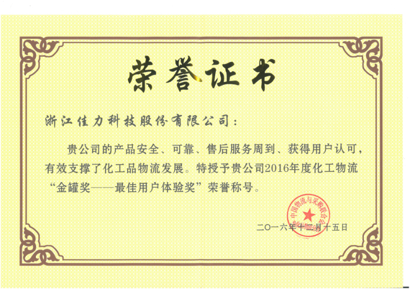 2016年度化工物流金罐獎—最佳用戶體驗獎